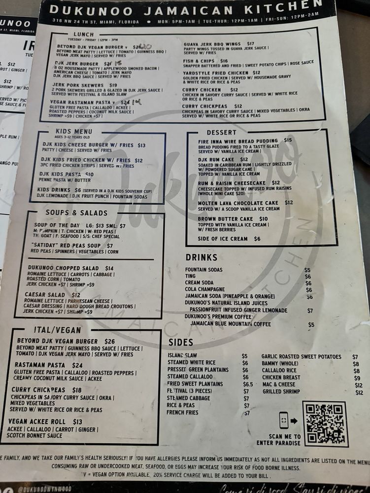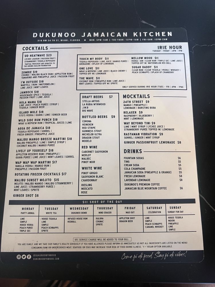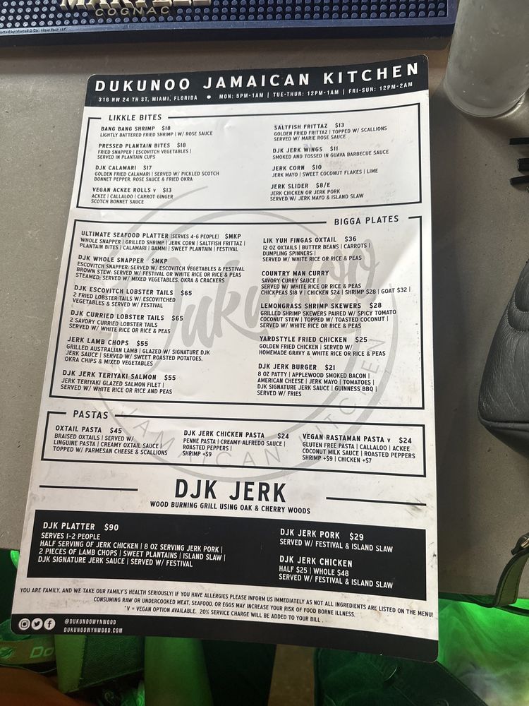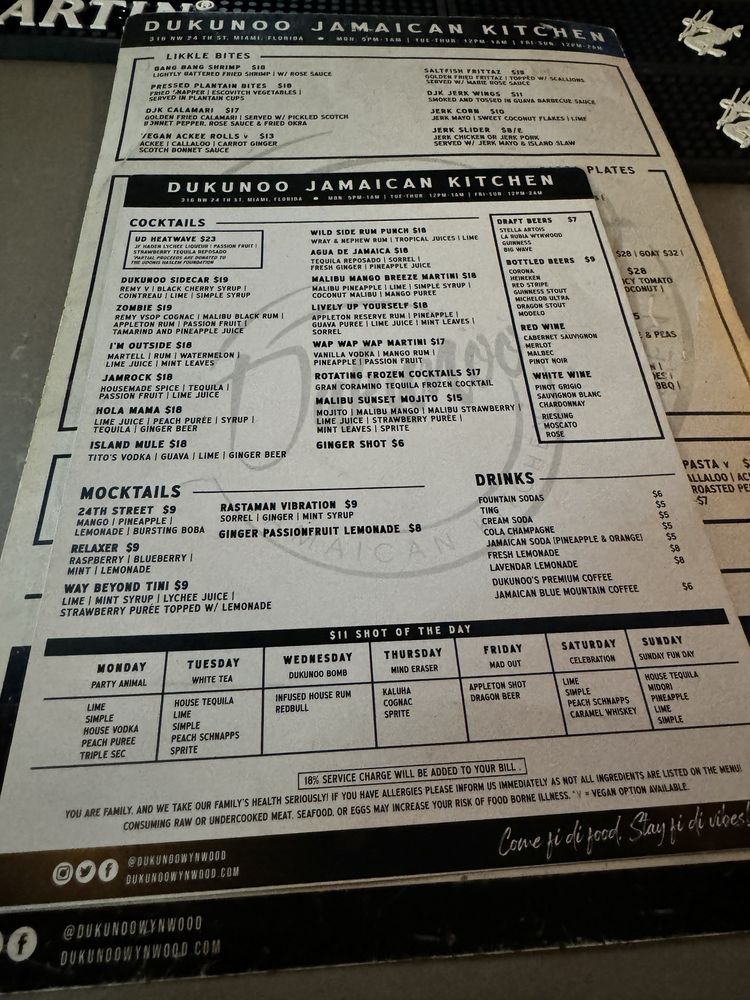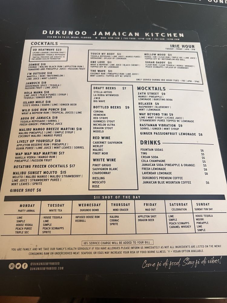 Dukunoo Jamaican Kitchen in Miami, FL offers a vibrant Caribbean dining experience with a cocktail bar ambiance. The restaurant provides a range of amenities including outdoor seating, DJ sets, and happy hour specials. The menu features flavorful dishes like Saltfish Frittaz, Curry Chicken, and Rum Cake. Customers have praised the attentive service from staff like Zhania and highlighted the sumptuous flavors of the food. While some reviewers noted minor issues like dryness in dishes or delays in appetizer service, overall, the atmosphere and dining experience at Dukunoo Jamaican Kitchen have left a positive impression. If you're looking for a lively spot with authentic Jamaican cuisine and a relaxing vibe, Dukunoo Jamaican Kitchen is a must-visit.