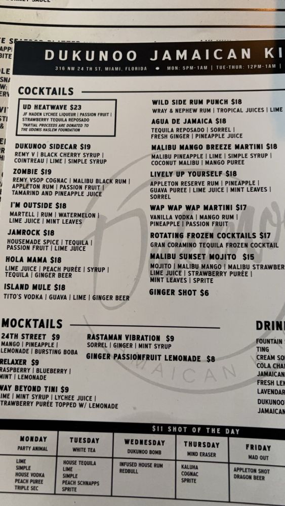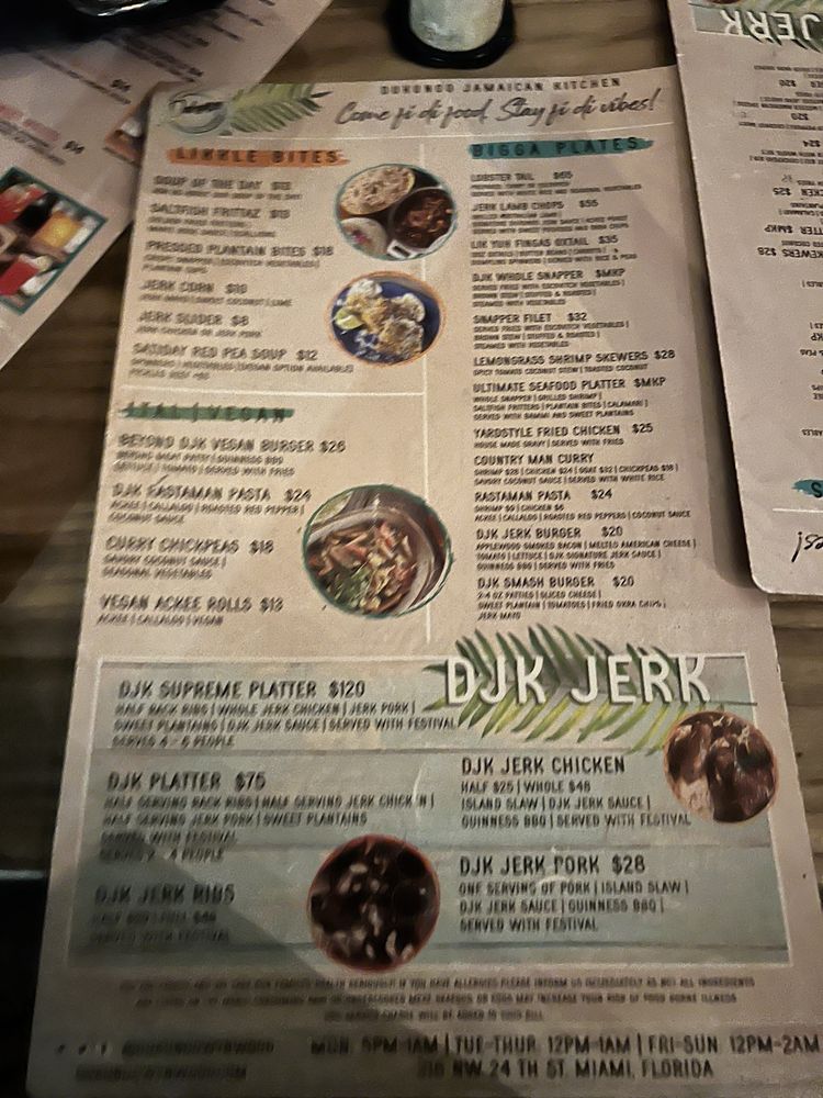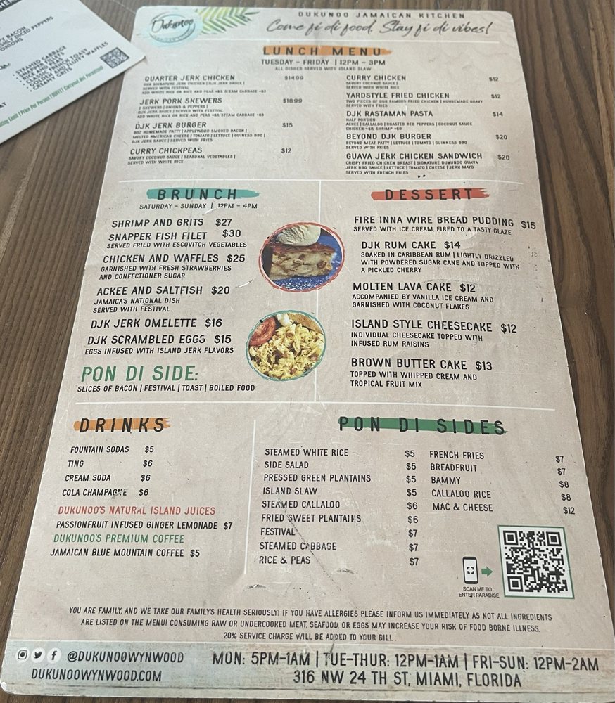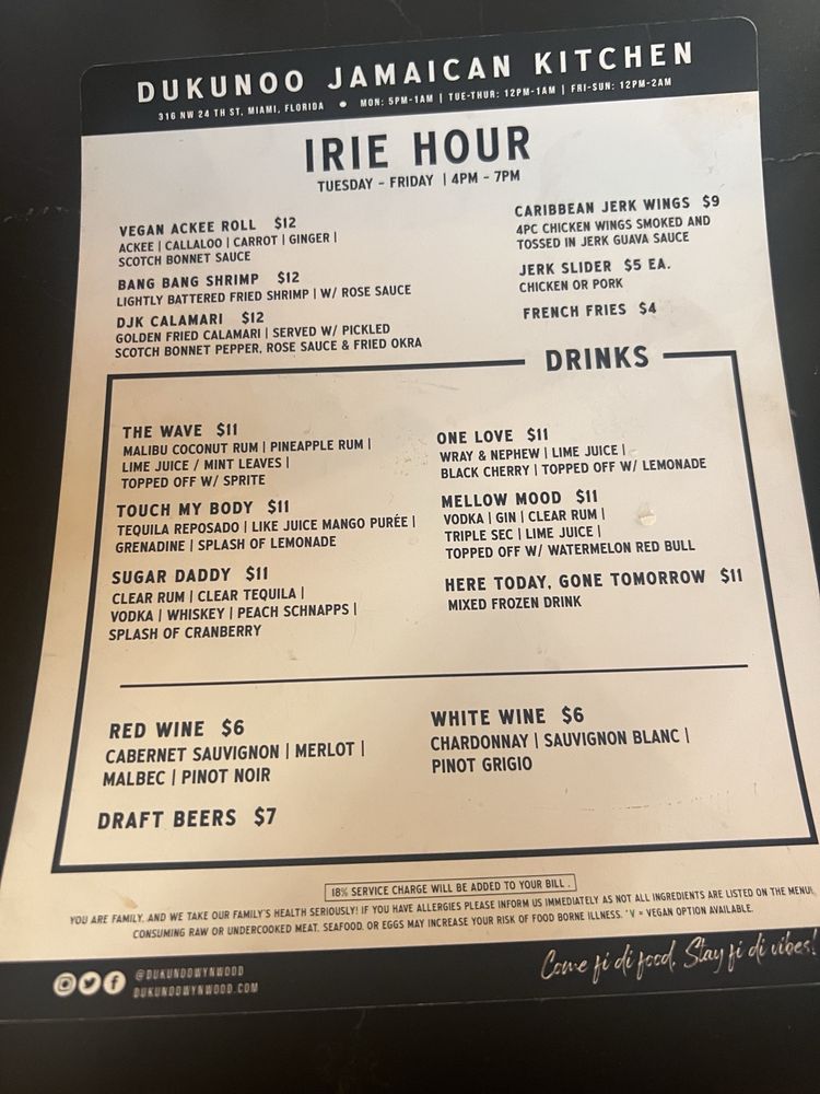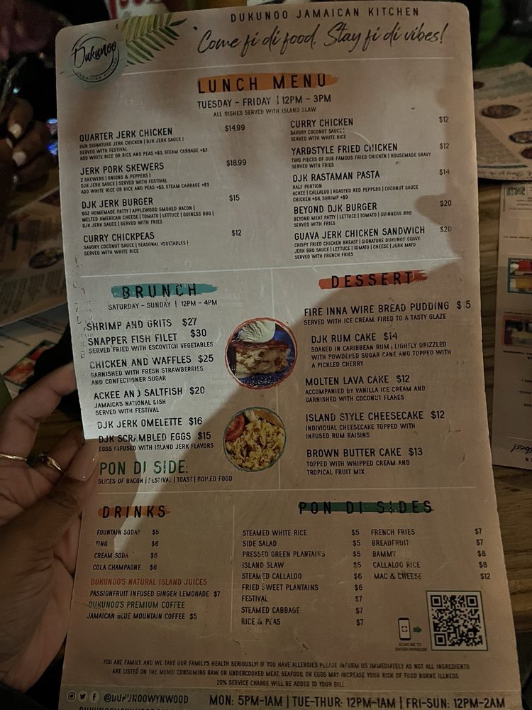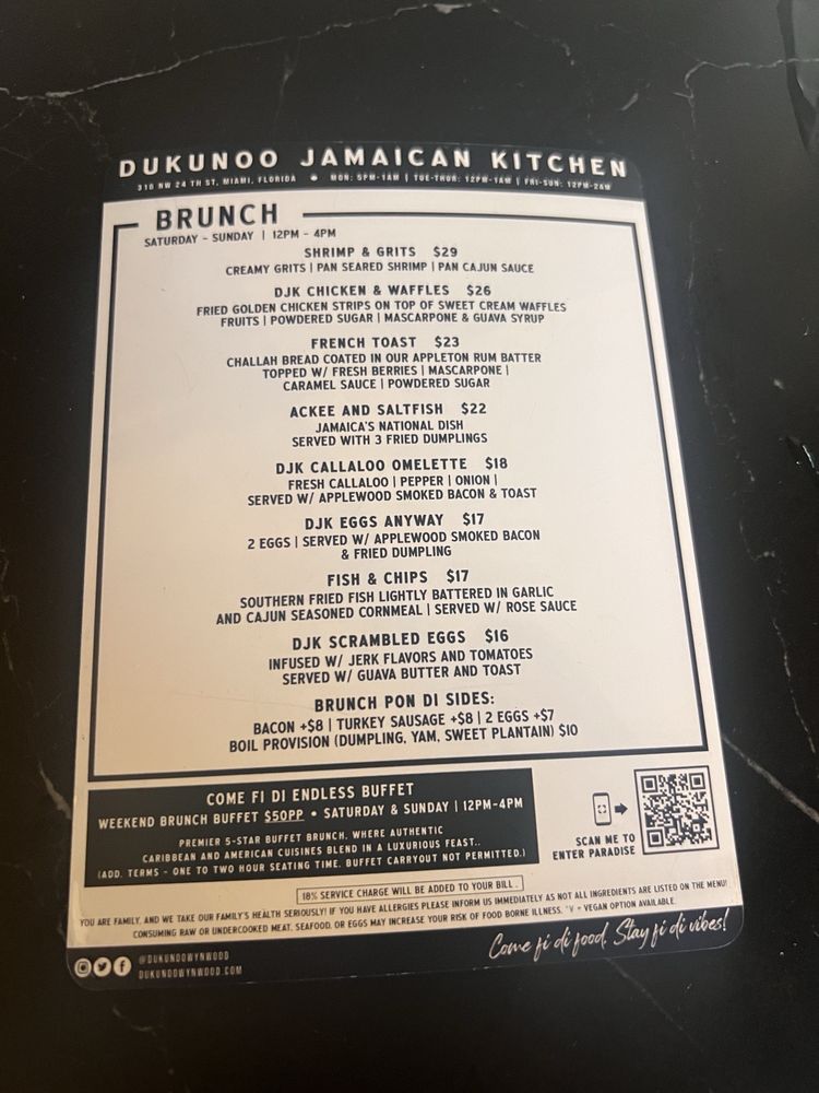 Dukunoo Jamaican Kitchen in Miami, FL offers a vibrant Caribbean dining experience with a cocktail bar ambiance. The restaurant provides a range of amenities including outdoor seating, DJ sets, and happy hour specials. The menu features flavorful dishes like Saltfish Frittaz, Curry Chicken, and Rum Cake. Customers have praised the attentive service from staff like Zhania and highlighted the sumptuous flavors of the food. While some reviewers noted minor issues like dryness in dishes or delays in appetizer service, overall, the atmosphere and dining experience at Dukunoo Jamaican Kitchen have left a positive impression. If you're looking for a lively spot with authentic Jamaican cuisine and a relaxing vibe, Dukunoo Jamaican Kitchen is a must-visit.